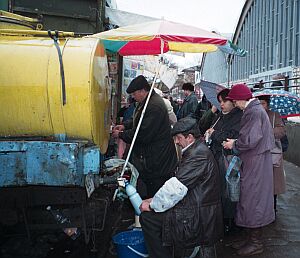 "На том берегу Днестра".Мумин Шакиров: Война в Приднестровье унесла тысячи человеческих жизней. Национальный фронт Молдовы потерпел поражение, но страна перешла с кириллицы на латиницу. Левый берег Днестра отказался говорить по-румынски и встал с оружием на защиту русского языка. Сепаратисты одержали победу и создали никем не признанную Приднестровскую Молдавскую республику. "По мере демократизации России ей станет противно исповедовать принцип, что Игорь Смирнов, конечно, сукин сын, но он - наш сукин сын". "Мы - не чеченцы, не кавказцы, здесь таких резких взрывов не бывает. Если мы - промышленная зона, грош нам цена, если мы не наладим производство вооружения. Голыми мы ходить не собираемся". "Я - сторонник мощной единоличной власти, так же как и Воронин - он царек". "Когда ввели наши деньги, мы называли их "суворики", а на правом берегу называли "приднестровики". Как говорится, пожуем - увидим, как сказали тигры, когда к ним прислали нового дрессировщика". "Я их не знаю. Вот подходит мужичок, говорит: "Вы - Том Маркович?" - "Да." - "Свали пожалуйста, иначе будет плохо"". Так почти каждый день безработный Олег Копарь добывает себе на пропитание. На Центральном рынке в Бендерах его знают многие, от местных торговцев до приезжих покупателей, от бродяг до участковых милиционеров. Людям нравится, как он поет. Крытый рынок в Бендерах - это самое оживленное и живописное место в городе. За его пределами - скучная архитектура промышленного райцентра и провинциальная бедность, а здесь, под куполом торгового зала - богатство красок, запахов, широкий ассортимент "сырого и вареного" и знакомая кулинарная лексика. Здесь продавцы - психологи, чужих опознают сразу: и по говору, и по внешнему виду, и по праздному любопытству. Человека из России вычисляют быстро, и им есть что сказать заезжему гостю. "Много денег, и бандитов много. Здесь денег нет, и бандитов нема". "Было мясо, ели щи, были все товарищи, появились господа - и исчезла вся еда. В Москве, конечно, веют метели, вам легче, вы там не в тюрьме. У вас пуховые постели, живете вы всегда в тепле. Живете вы всегда в достатке, не ощущаете тоску, а мне приходится несладко жевать вонючую треску. Сейчас треска дорогая". Цены на рынке в полтора раза ниже, чем в Москве. Но для тех, кто получает 50 долларов в месяц (такова средняя зарплата в Приднестровье), кусаются. Но понятно, что люди здесь не живут на одну получку: где-то подрабатывают, где-то подворовывают, где-то экономят. Одних кормит челночный бизнес, других - земля, благо климат в Молдавии мягкий.